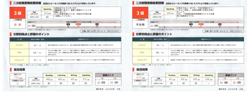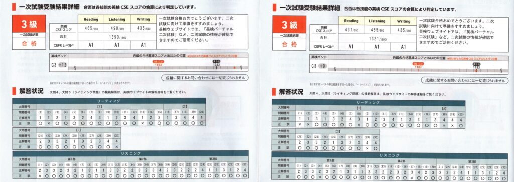 このブログに定期的に立ち寄って読んでくれている方は稀有な存在と思いますが、以前から、竜子と竜太の英検 3 級の過去問の出来栄えについて記載していました。竜子は勉強用のテキストに収録されていた練習用の模擬問題では点数的にイマイチでしたが、それでもまぁギリギリ合格しそうな正答率でした。一方の竜太は合格圏外。そして手持ちの実際の過去問を数年分取り組ませましたが、竜子は安定して 8-9 割くらいの正答率、竜太は 6 割前後から 7 割の正答率という状況で、竜子の一次試験合格はほぼ間違いなく、竜太はギリギリ合格か、もしくは不合格もあり得るかと思っていました。
